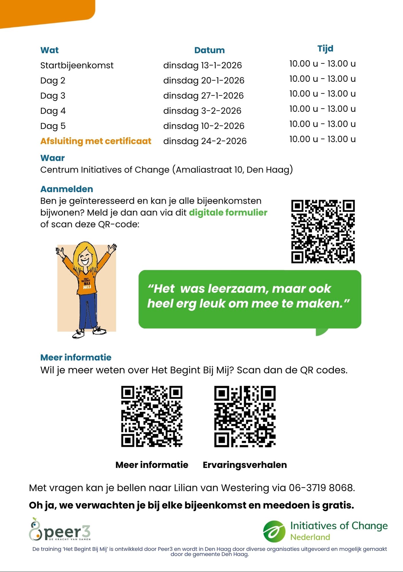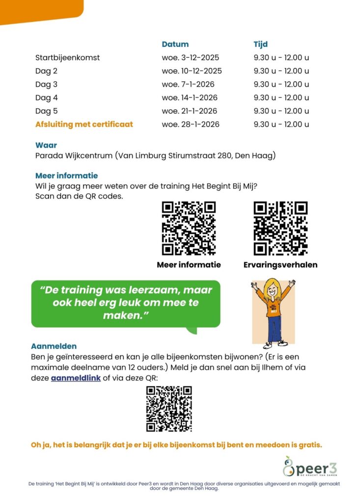 In de flyers hieronder zie je alle trainingen en bijeenkomsten die in Den Haag op de planning staan. Daarin is ook te lezen hoe je je kunt aanmelden.